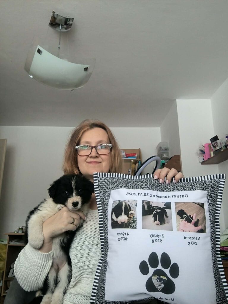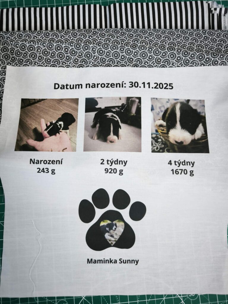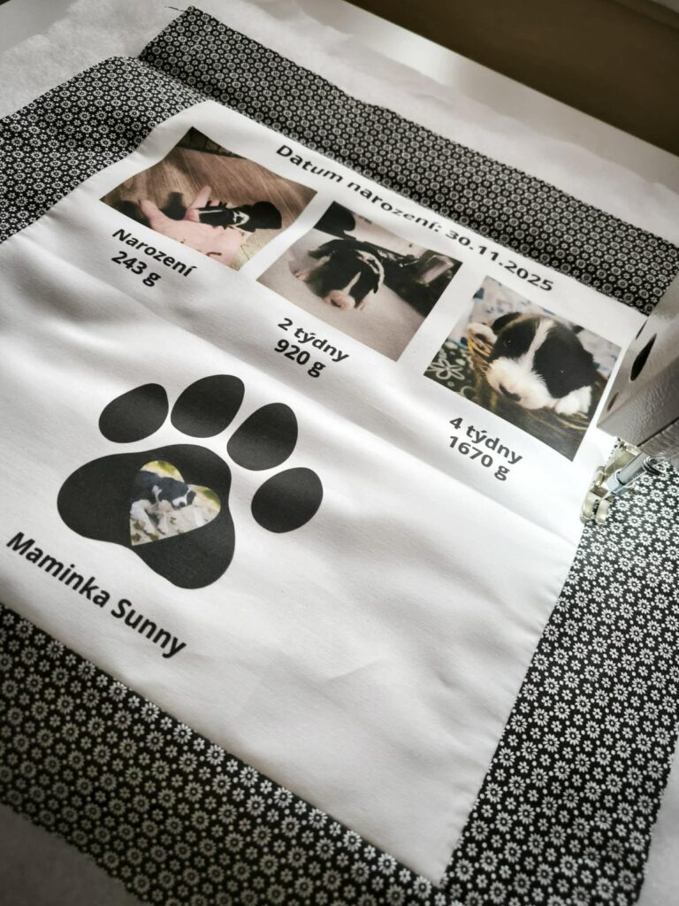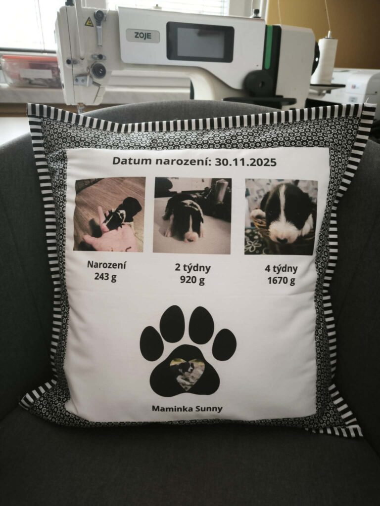 Památeční polštářek, který zachycuje první čtyři týdny Maynky života. Něco, co si noví majitelé mohou vzít s sebou jako tichou připomínku začátku společné cesty.