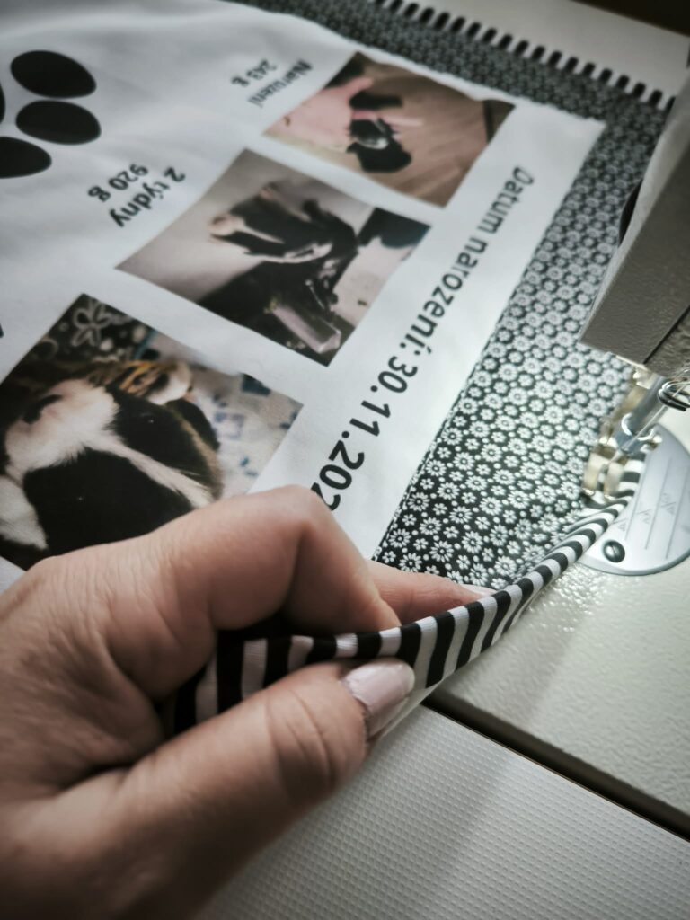 V téhle fázi se jednotlivé části spojují dohromady. Z fotek, látek a výplně vzniká polštářek, který má nejen tvar, ale i význam.